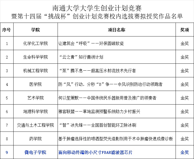 12月16日,我校举办大学生创业计划竞赛暨第十四届“挑战杯”创业计划竞赛校内选拔赛决赛,现场足球直播 项目“面向移动终端的小尺寸FBAR滤波器芯片”喜获科技创新和未来产业组别金奖。