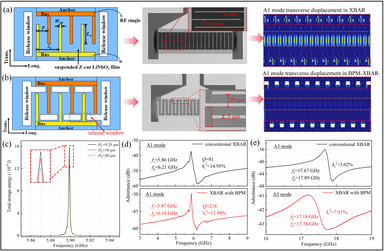 射频声学滤波器芯片是处理射频信号的核心部件之一,具有频率选择以及抑制干扰信号的功能,广泛应用于雷达、通信射频前端等电子系统。对于高端射频声学滤波器,国内在材料、工艺和设计经验等方面的基础相对薄弱,被《科技日报》列为35项“卡脖子”技术之一。谐振器是组成射频声学滤波器的基本单元,是决定其性能的关键核心单元。为了解决声表面波滤波器工作频率低和带宽小等问题,团队研究了基于铌酸锂单晶薄膜的横向激励体声波谐振器(XBAR)。凭借反对称模式声波的高声速和铌酸锂单晶薄膜优异的压电特性实现了近6 GHz的一阶反对称模式(A1模式)谐振和18 GHz的三阶反对称模式(A3模式)谐振。针对XBAR器件中所出现的品质因数(Q值)低和杂散模态严重问题,团队利用损耗分析模型研究了横向边界宽度对器件体内能量损耗和总储能的影响,设计并制造了具有宽带活塞模式结构的谐振器,有效抑制了由器件横向方向上非理想位移分量引起的杂散模态,实现了A1模式12.98%和A3模式7.91%的机电耦合系数,Q值提升了接近70%,成功研制出具有高频和大kt2优势的反对称兰姆波谐振器,为构建面向C-band和Ku-band的大带宽、低损耗滤波器提供了技术支撑,在5G/6G射频前端中极具应用前景。