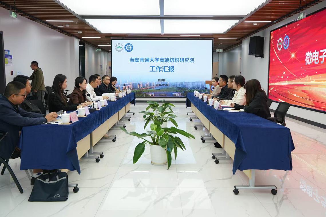 10 月 22 日上午,学院党总支书记金翼、副院长(主持工作)赵继聪带领班子成员及科研骨干等前往海安南通大学高端纺织研究院,就研究院建设规划、科研工作推进、产学研协同合作等内容开展学习交流。