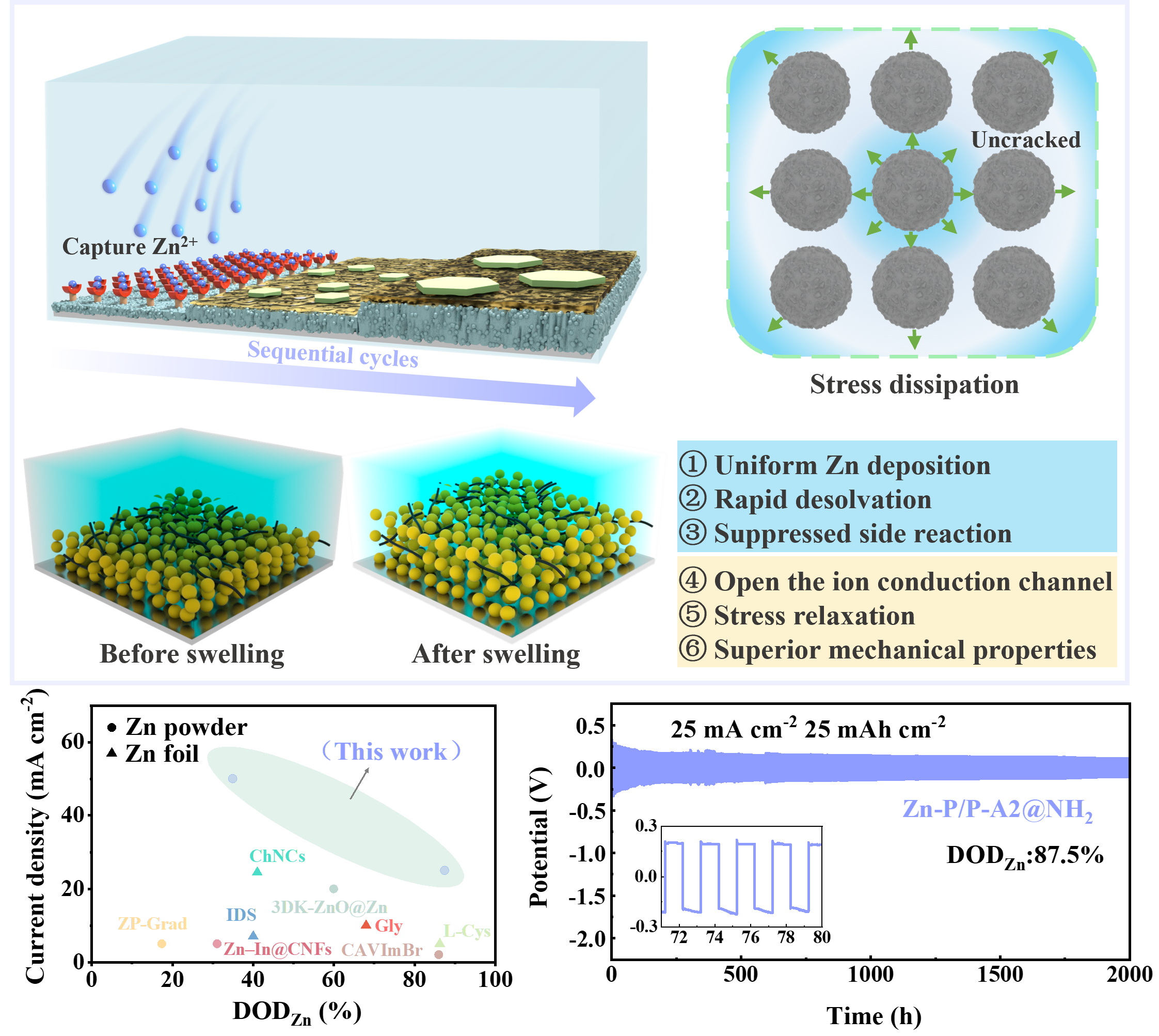 水系锌离子电池因其安全性高、成本低,被认为是新一代储能体系的重要候选。但相较于锌箔,锌粉负极虽然具有比表面积大、可设计性强等优势,却在实际循环中面临颗粒间应力集中、枝晶生长及界面副反应等难题,导致在高电流密度和大容量条件下迅速衰退。如何在高倍率、长寿命与高锌利用率之间取得平衡,是制约锌粉负极实用化的核心挑战。研究团队创新性地设计了一类软弹性氨基功能聚合物添加剂,在锌粉颗粒间构建可溶胀的三维网络结构。电解液浸润后,该网络能够像“缓冲层”一样分散循环过程中产生的内应力,同时在颗粒之间建立连续的Zn2+传输通道。聚合物中丰富的-NH2/-NH-位点还能重构Zn2+的溶剂化结构,降低脱溶剂化能垒,从而实现更加温和、可控的沉积行为。在晶体层面,氨基基团对Zn(002)晶面的选择性吸附诱导了择优取向沉积,使锌沉积由无序枝晶转变为致密平整结构,显著抑制了副反应和界面破坏。在此协同调控机制下,锌粉负极在2.5 mA cm-2/0.5 mAh cm-2条件下可稳定循环超过8300小时;在25 mA cm-2/25 mAh cm-2的苛刻条件下仍保持长期稳定运行,展示出“高电流-高容量-超长寿命”同步达成的优异性能。进一步组装的全电池与柔性软包器件在高倍率、低自放电及形变条件下均展现出稳定输出,验证了该策略的工程应用潜力。