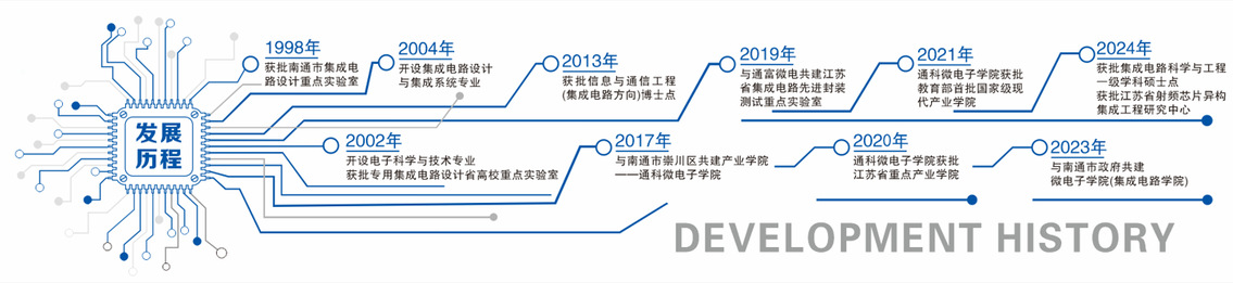 南通大学集成电路相关专业的发展可溯源至上世纪90年代,是国内较早开展集成电路教学科研的高等院校之一。1998年成立了南通市集成电路设计重点实验室;2002年,经教育部批准开设电子科学与技术专业,同年获批专用集成电路设计省高校重点实验室;2004年开设集成电路设计与集成系统专业;2013年,获批信息与通信工程一级学科博士点,下设通信与信息系统集成电路二级学科博士点;2017年与南通市崇川区合作共建产业学院——通科现场足球直播 ;2019年与通富微电共建江苏省集成电路先进封装测试重点实验室;2020年通科现场足球直播 获批江苏省重点产业学院;2021年获批教育部首批现代产业学院;2024年重组获批半导体器件与集成电路设计封测省高校重点实验室,申报获批集成电路科学与工程一级学科硕士点、江苏省射频芯片异构集成工程研究中心。